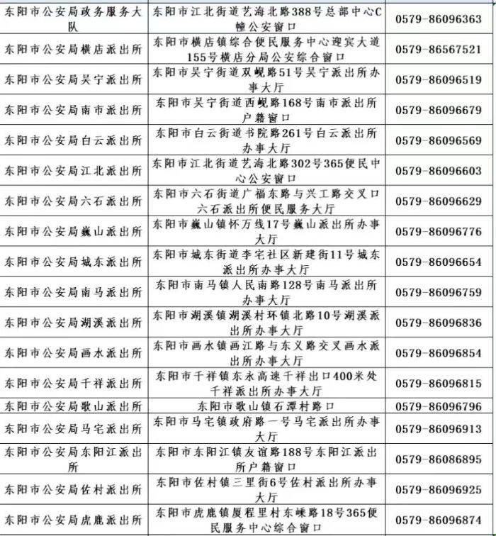 东阳市政务服务大厅户政窗口和行政区内派出所户籍窗口地址与电话信息表如下: