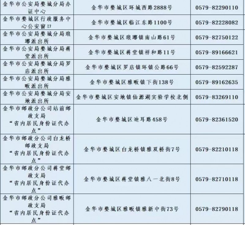 金华市婺城区政务中心户政窗口和派出所身份证办证地点和咨询电话: