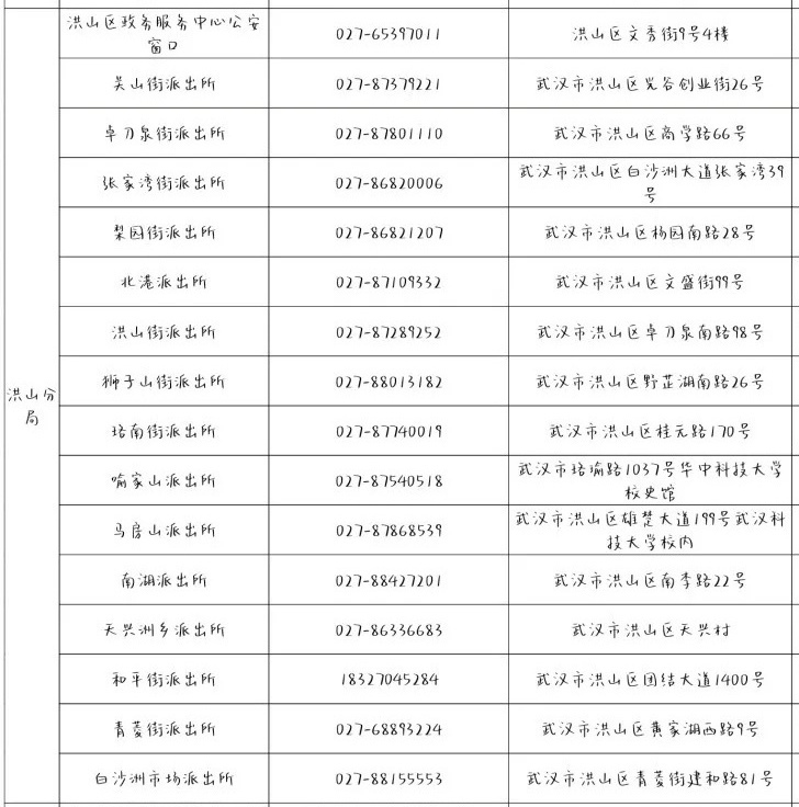 洪山街派出所户籍窗口地址:武汉市洪山区卓刀泉南路98号,咨询电话:027-87289252