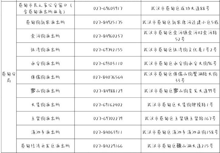 武汉市蔡甸区市民之家户政窗口和辖区派出所户籍窗口地点和服务电话