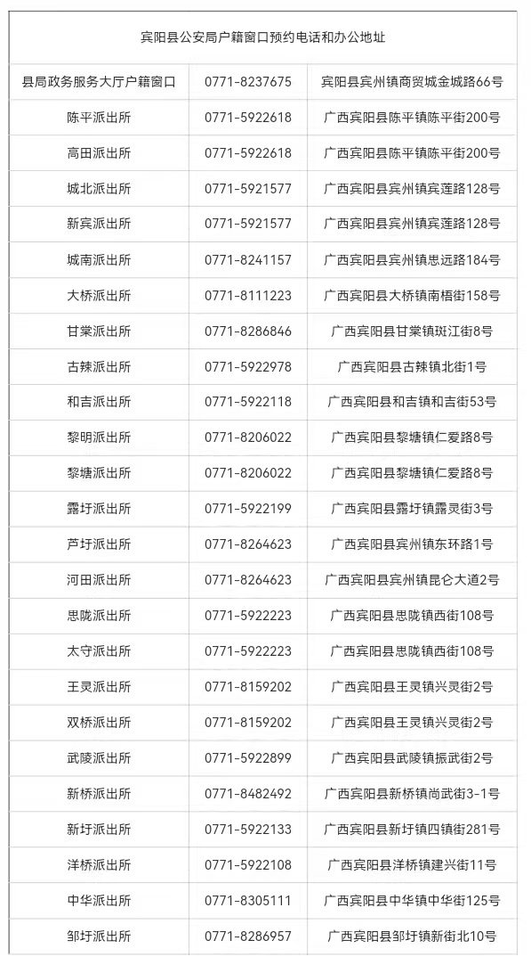 宾阳县政务服务中心和派出所户籍窗口咨询电话和办公地址:群众可选择就近的办理点,为减少集中换证期间排队等候时间,建议广大群众尽量避开人员密集地区办证点办理,或提前预约、错峰办理。