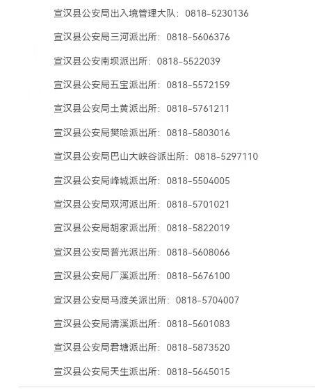 提示:关于宣汉县辖区各派出所户籍办证业务咨询电话信息作出免责声明,此信息图文仅供参考,小编不承担任何法律责任。此信息来源于有关机构的公开内容,在此经过整理并转载,唯一的目的是通过互联网传播便民惠民信息。由于时间等原因,难免使信息发生变更,此信息如有侵权,或者差错,请联系删除,直接联系便民信息平台秋果黄页网客服电话(187-8199-3958微信同号),一定会及时删除和修正。