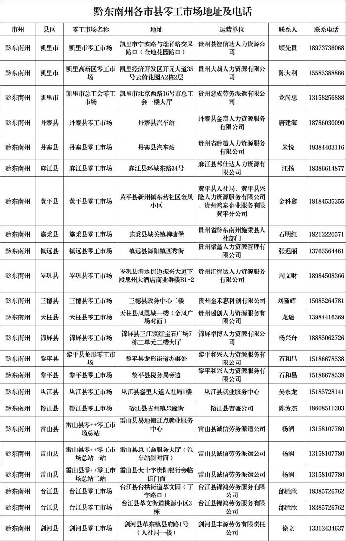 说明:关于黔东南州各市县零工市场地址和电话信息作出特别说明:本信息立足为社会大众提供有价值的参考资料和办事指南等公共信息,部分图文来源于网络或者有关机构公开内容,属于公益性的分享与传播。虽然尽力确保内容的准确性和实效性,但由于各种因素,难免存在疏忽和差错,敬请不吝赐教,欢迎相互交流,共同学习。对信息中陈述、观点判断保持中立,版权属原作者所有,如涉侵权或者差错等问题,请联系网络信息推广平台秋果黄页网客服(187/8199/3958微信同号),一定会及时删除或者修正。谢谢!