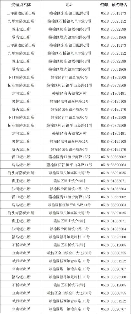 连云港市赣榆区辖区各派出所户籍办证地址和咨询预约电话信息表: