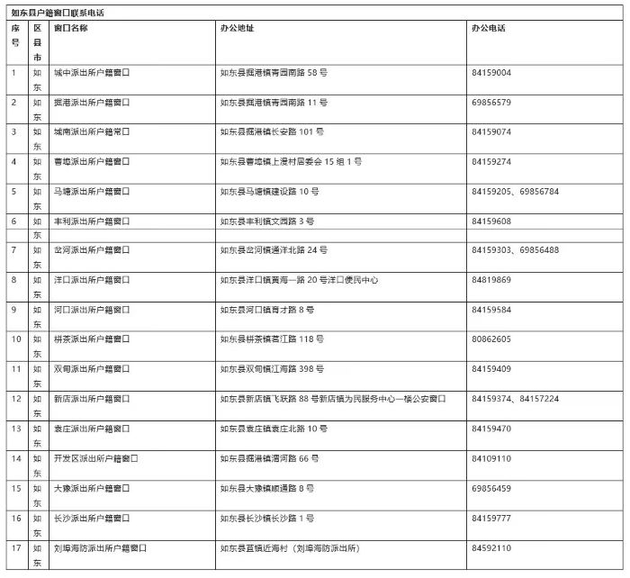 为方便居民办理各项户政业务,如东县全县各派出所户籍、居民身份证窗口实行居民身份证轮值轮办,同时实行预约办理服务,请有需要的居民提前做好安排。如东县各派出所户籍窗口户口身份证等办理咨询办公电话如下: