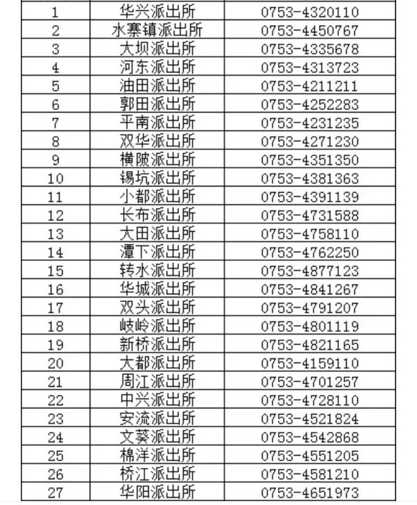 五华县小都派出所电话0753-4391139;五华县长布派出所电话0753-4731588;
