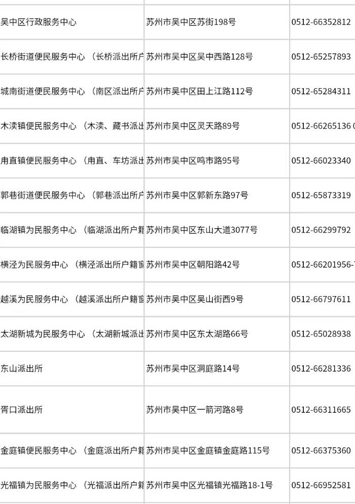 苏州市吴中区各辖区派出所户籍窗口地址和咨询服务电话: