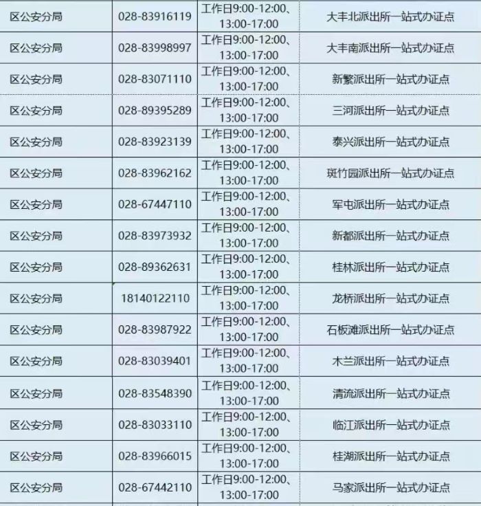 成都市新都区行政辖区派出所一站式办证服务点服务电话信息表如下: