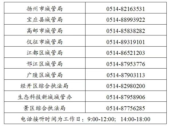 扬州市各县(市、区)、功能区的投诉举报电话为: