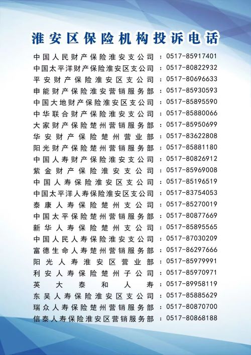 金融监督管理总局淮安市淮安区监管支局辖区保险机构投诉电话