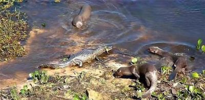 巨獭攻击鳄鱼时,通常会采用背后偷袭的战术。它们会先封住鳄鱼的去路,然后采用挑衅战术,让鳄鱼疲于奔命。同时,巨獭会不断攻击鳄鱼的后背,因为鳄鱼的转身速度极慢,一旦上岸就会被灵活的巨獭绕后攻击。在亚马逊河,经常会出现一些“无尾鳄鱼”,它们的尾巴都是被巨獭咬掉的。
