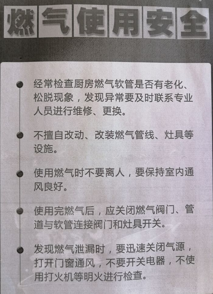 发现燃气泄漏时,要迅速关闭气源,打开门窗通风,不要开关电器,不使用打火机等明火进行检查。