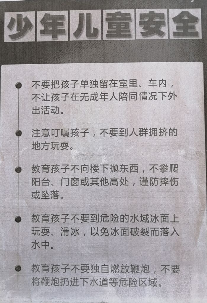 不要把孩子单独留在室里、车内,不让孩子在无成年人陪同情况下外出活动。