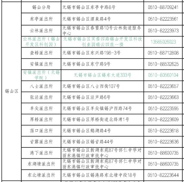 无锡市锡山区各派出所户籍窗口居民身份证受理点咨询电话如下: