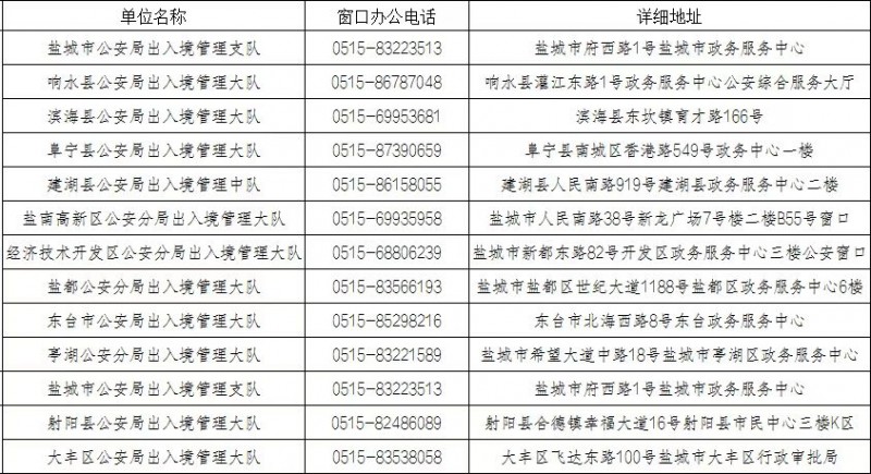 盐城市出入境窗口(各区、市、县出入境业务窗口电话和地址)信息大全: