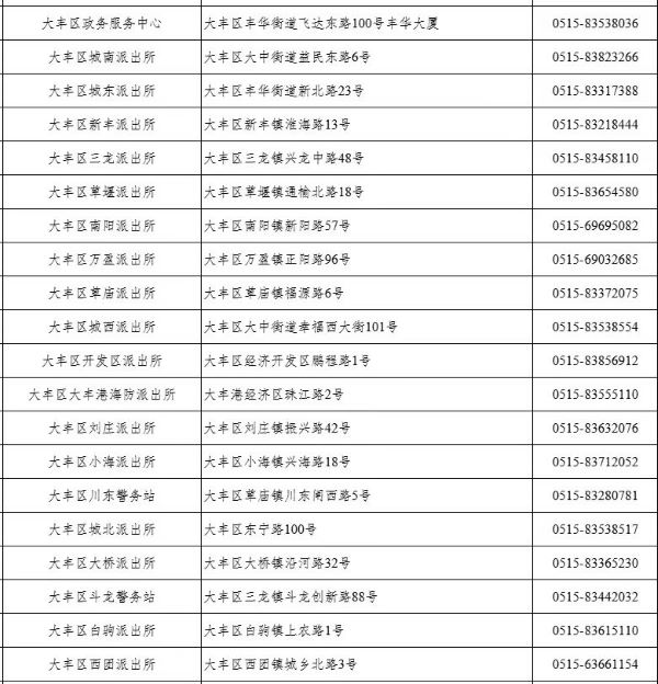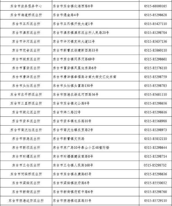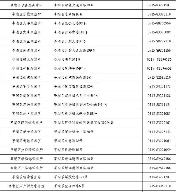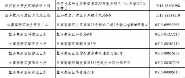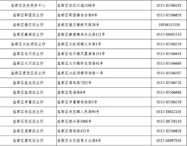 盐城市各区(市)县辖区派出所户政窗口身份证办理地址和电话信息大全如下: