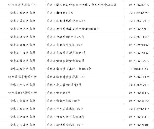 盐城市响水县政务服务中心户政窗口和辖区派出所户籍窗口身份证办理地址及咨询电话