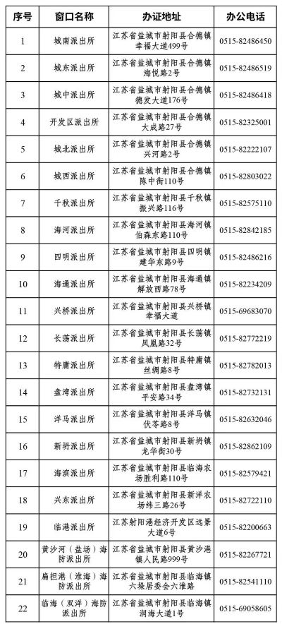 说明:关于射阳县全县辖区各派出所户籍窗口办公地址和咨询电话信息作出免责声明,此信息图文仅供参考,小编不承担任何法律责任。此信息来源于有关机构的公开内容,在此经过整理并转载,唯一的目的是通过互联网传播便民惠民信息。由于时间等原因,难免使信息发生变更,此信息如有侵权,或者差错,请联系删除,直接联系便民信息平台秋果黄页网客服电话(187-8199-3958微信同号),一定会及时删除和修正。
