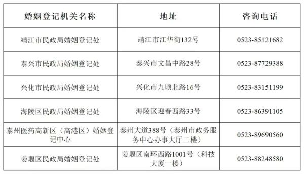 姜堰区婚姻登记服务中心;姜堰区南环西路1001号(科技大厦一楼),联系电话0523-88248580;