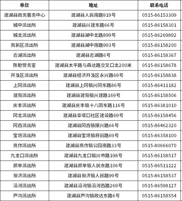 便民电话:建湖县交警车管所、出入境窗口和各户籍窗口地址及联系电话