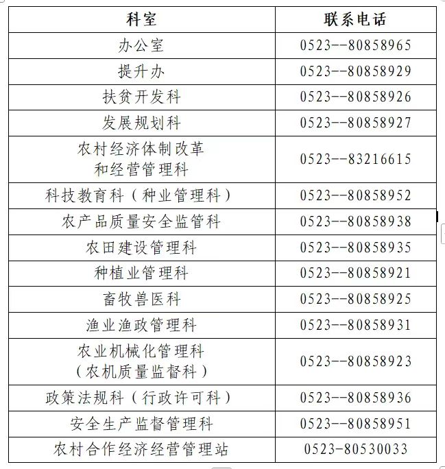 兴化市农业农村局对外服务电话通讯录如下: