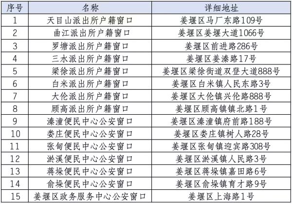 泰州市姜堰区全区共15个居民身份证业务受理点,泰州市姜堰区政务服务中心户政窗口和派出所户籍窗口地址如下: