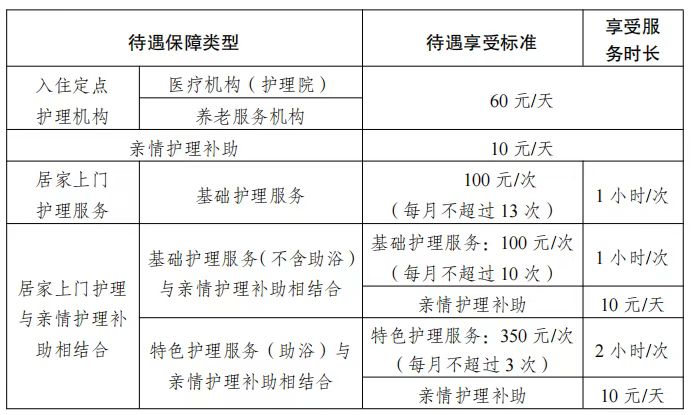 在市外(不含境外)居住的失能人员,经失能评估符合待遇享受标准的,长护险基金统一暂按10元/天的标准支付亲情护理服务补助。市内重度失能人员居家亲情护理服务补助和市外(不含境外)居住的重度失能人员亲情护理服务补助在季末后第一个月的月初5个工作日内进行发放。