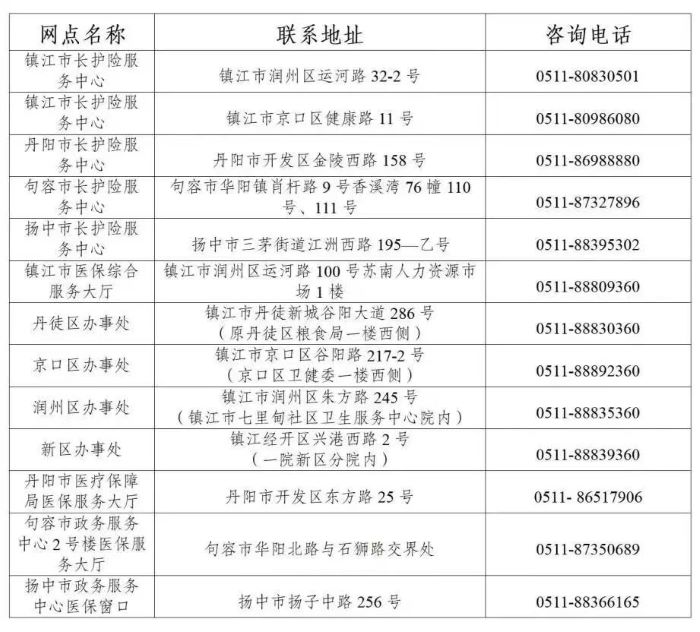 镇江市医保全市长护险经办线下受理网点联系地址和咨询电话