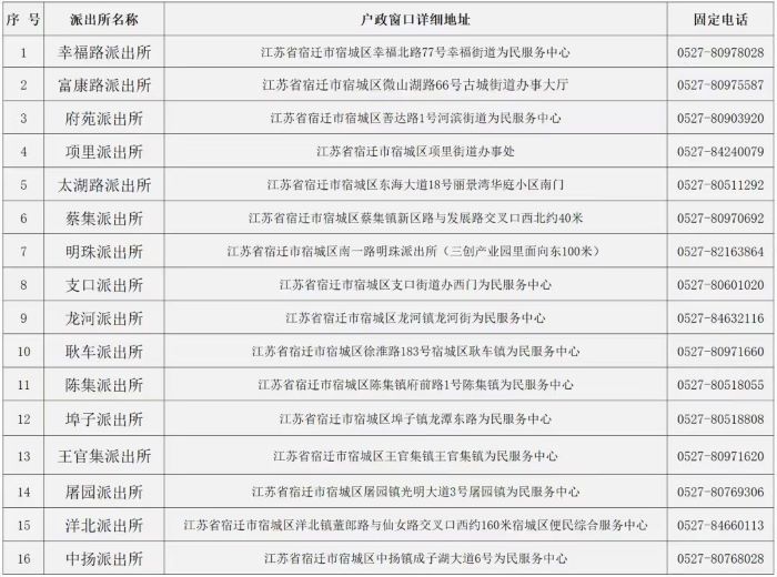宿迁市宿城区各派出所户政窗口详细地址和固定电话信息表如下: