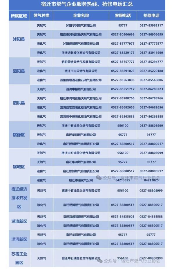 宿迁市全市辖区燃气企业客服实用信息汇总:宿迁市市民朋友们,为进一步规范我市燃气经营市场秩序,努力满足广大市民的生活需求,更好服务于民,宿迁市燃气行业协会对我市各县区管道天然气及瓶装液化气企业的服务电话及线上充值小程序进行了汇总与更新,请大家收藏好吧 ,真有用!