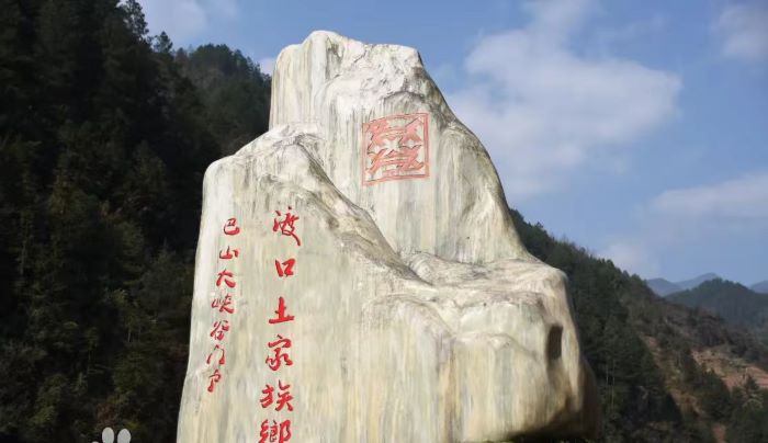 渡口是一个土家族自治乡。渡口秀美的风景,淳朴的民风,深深地吸引了我,没有顾得上一路的风尘与疲劳,就沿着峡谷的小路,直奔大巴山地质公园。渡口的地质公园,没有万源八台山的地质公园庞大,她依峡谷而建,公园的右前方紧邻峡谷是用整块花岗石雕刻的“大巴上国家地质公园”石碑,石碑高约15米,红色隶书写成,隶书下方是具有大巴山峡谷瀑布奔涌特征的浮雕,基座采用朱红色大理石镶嵌。公园的正方是用汉白玉雕刻的神兽白虎,黑色底座,高约三米。左边是大巴山风格的土家族陈列馆,陈列馆一楼一底各三间,占地约200平米见方。