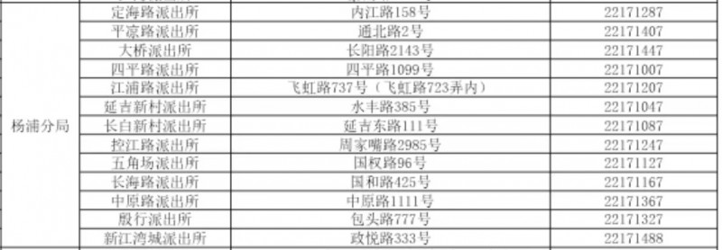 上海市杨浦区各辖区派出所服务窗口户籍身份证业务地址和联系电话