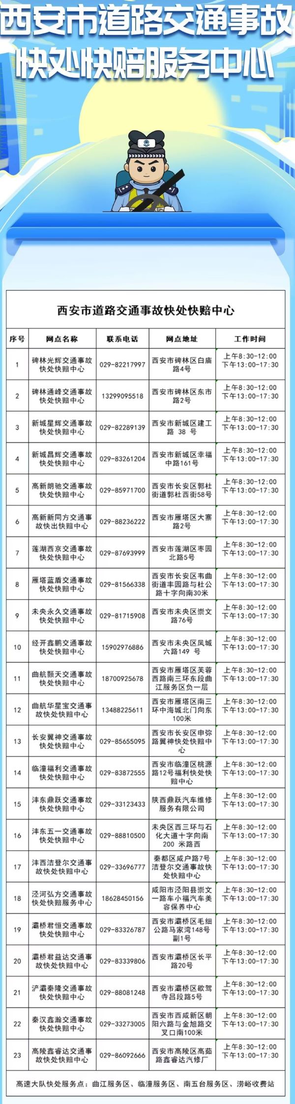为保障大家一路畅行,减少因轻微交通事故处理等待带来的拥堵与烦恼,西安交警贴心整理了全市快处快赔服务中心信息,若您在路上发生符合条件的轻微事故请优先选择“快处快赔”,省时省心又省力。让我们共同守护您和家人的平安旅程。西安市全市道路交通事故快处快赔服务中心地址电话信息大全如下: