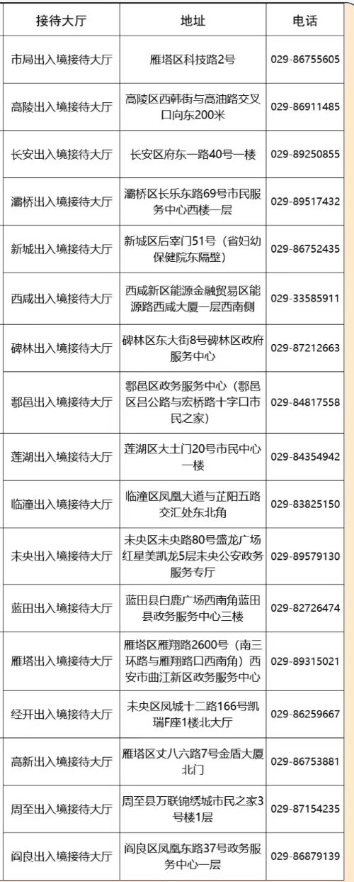 西安市全市出入境办证接待大厅地址和电话信息表如下: