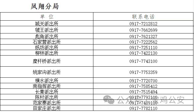 说明:关于宝鸡市凤翔区各属地派出所户籍业务电话信息作出免责声明,此信息图文仅供参考,小编不承担任何法律责任。此信息来源于有关机构的公开内容,在此经过整理并转载,唯一的目的是通过互联网传播便民惠民信息。由于时间等原因,难免使信息发生变更,此信息如有侵权,或者差错,请联系删除,直接联系便民信息平台秋果黄页网客服电话(187-8199-3958微信同号),一定会及时删除和修正。