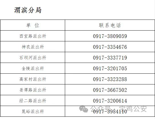 宝鸡市渭滨区分局下属各派出所户籍窗口业务电话