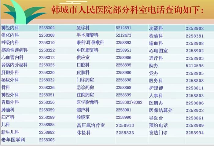 说明:关于韩城市人民医院部分科室电话的信息仅供参考。