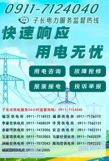 国网子长市供电公司24小时电力服务抢修监督热线电话0911-7124040,全时段快速高效响应子长市区域内广大市民在用电业务咨询、电力故障报修、用电业务办理、工作人员服务态度监督、投诉建议等各类用电需求。