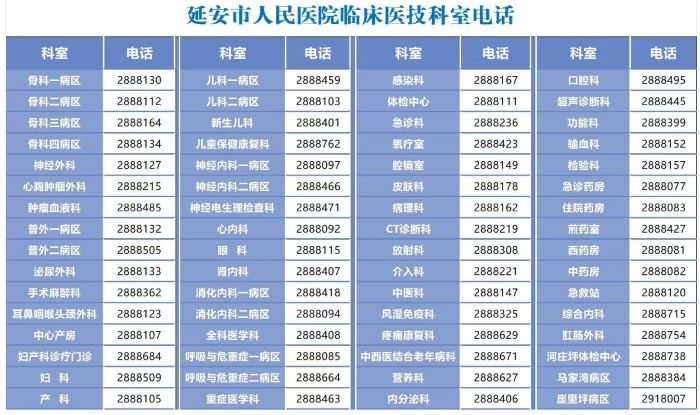 延安市人民医院临床和医技科室电话信息表如下: