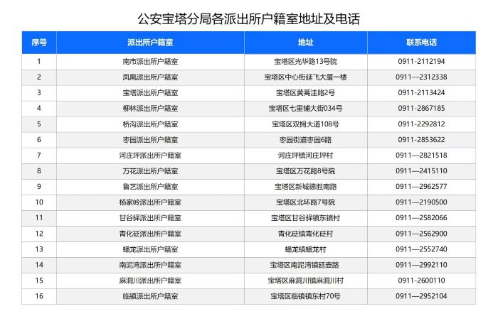 延安市宝塔区分局各派出所户籍业务咨询电话