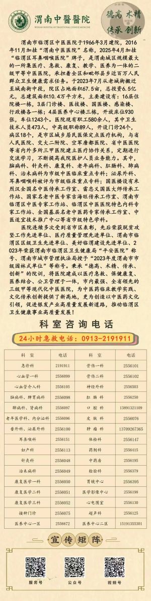 说明:关于渭南市临渭区中医医院科室咨询电话的信息仅供参考。