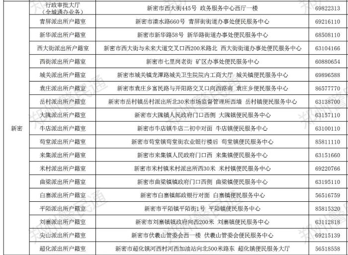 行政审批大厅(全城通办业务)地址:新密市西大街445号政务服务中心西厅一楼,户口身份证等业务电话:0371-69822313