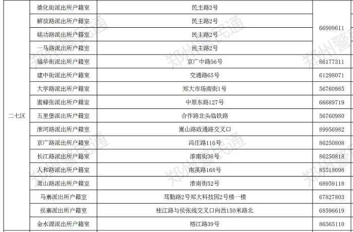 郑州市二七区各派出所户籍室办公地址和户口身份证等咨询电话