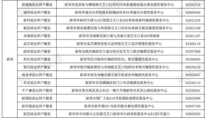 郑州新郑市各派出所户籍室地址和户口身份证等咨询电话: