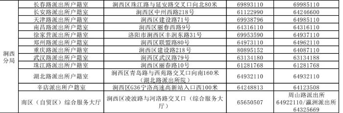 南区(自贸区)综合服务大厅户政窗口地址:洛阳市涧西区凌波路与河洛路交叉口(综合服务大厅),户籍类业务咨询预约电话:0379-65650507、周山路派出所64922110/瀛洲派出所64325669
