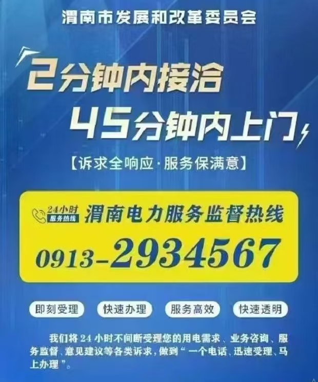 渭南市电力服务监督热线0913-2934567,拨打热线电话,用电需求马上办。