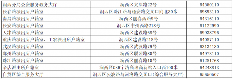 洛阳市涧西区各派出所户籍室地址和服务电话: