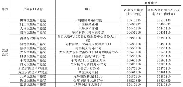 嵩县各辖区派出所户籍室地址和户口身份证等业务电话