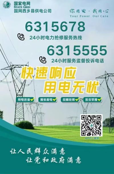 国网西乡县供电公司温馨提示,客户遇到用电困难,联系供电所时,请用户准确提供以下信息:报修人姓名、联系电话和用户编号;居住地址和故障地点(某某小区、某地标性建筑或道路、村民组等);描述停电范围(一户或多户等);有无明显的故障现象(表箱着火、断线等)。国网西乡县供电公司会用最快的速度、最短的时间到达您的身边。24小时电力服务抢修电话(0916-6315678)24小时服务监督投诉电话(0916-6315555)