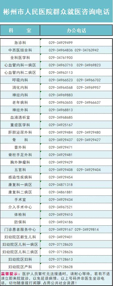 说明:关于彬州市人民医院群众就医咨询电话表的信息仅供参考。